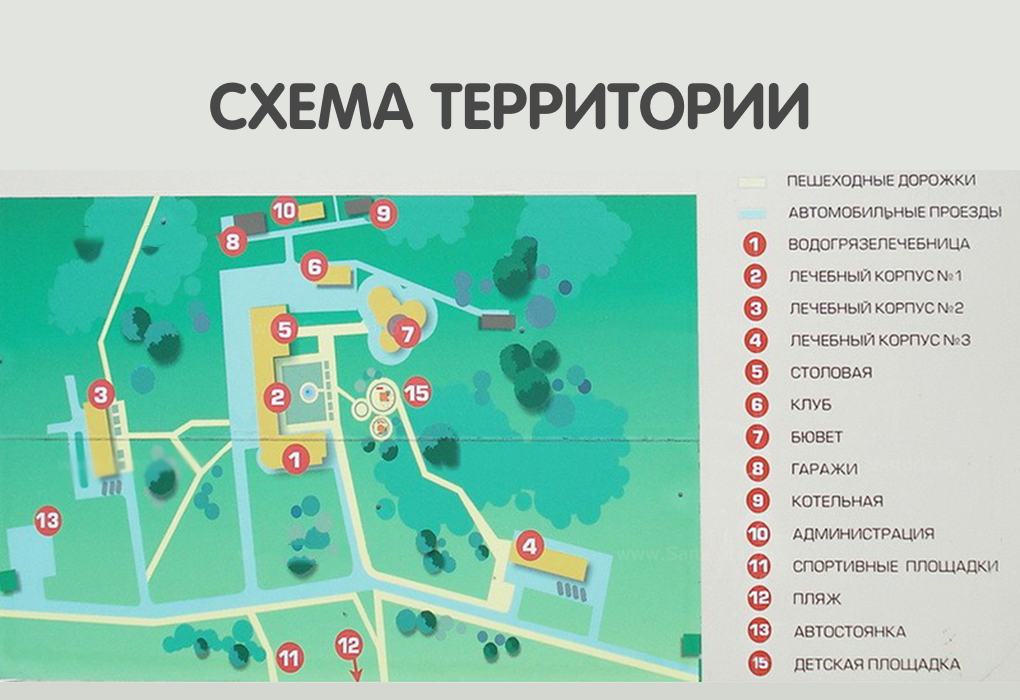 Размещение: Корпус №1 (4-этажный, есть лифт), соединяется переходом с помещением столовой и водолечебницей (4-этажный, есть лифт).