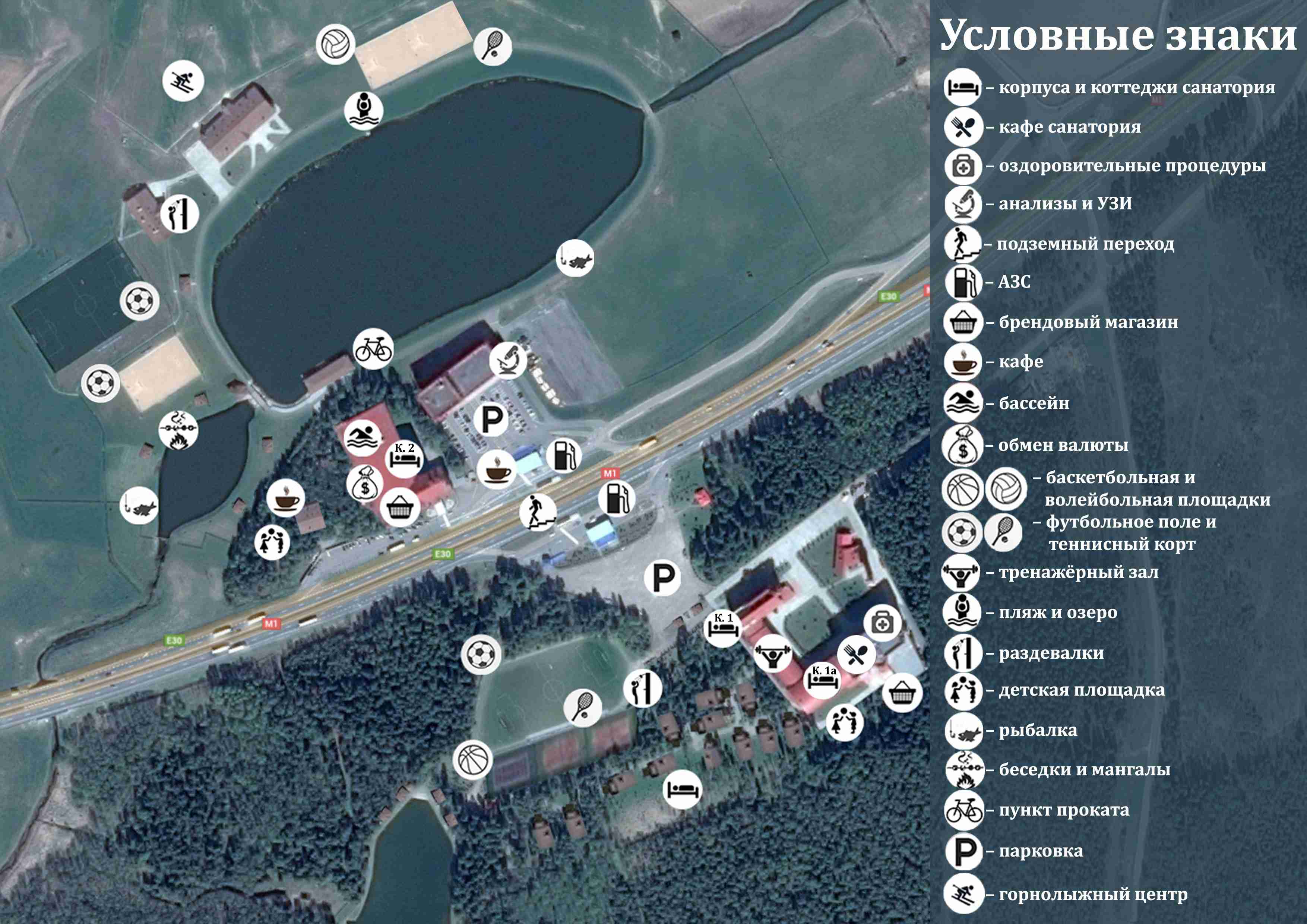 Корпус №2 находится у а/д М-1/Е-30. На процедуры и питание из корпуса №2 нужно ходить через улицу и подземный переход в корпус №1, №1а.