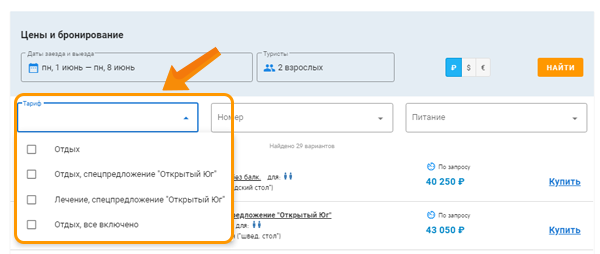 На странице отеля, вы можете быстро выбрать предложения по типу питания, категории номера или тарифу.