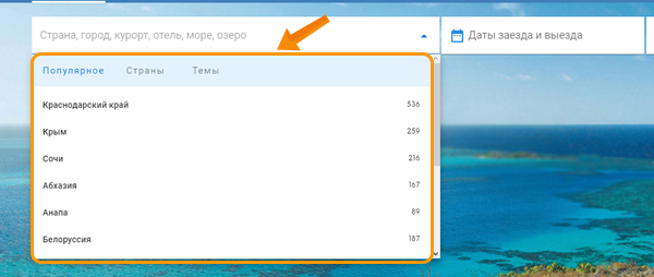 В поисковой строке теперь появились подсказки: «Популярное», «Страны» и «Темы отдыха». Цифры означают количество средств размещения или экскурсионных туров. Теперь вы сможете видеть весь большой ассортимент Туроператора «Дельфин».