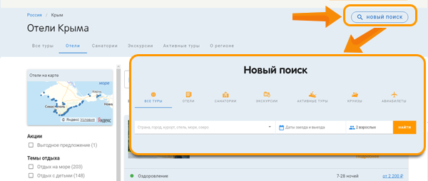 Поиск тура можно продолжить с любой страницы. Теперь вам не нужно возвращаться на главную страницу, чтобы начать новый поиск. Вы можете сделать это на любой странице. Для этого, в правом углу сайта, нажмите «Новый поиск».