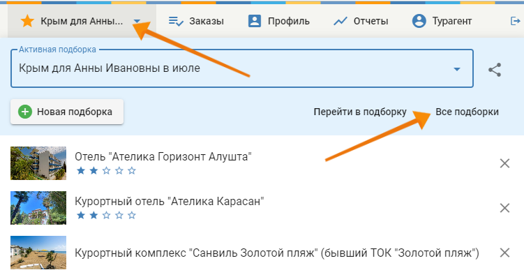 Список всех ранее созданных подборки находится по адресу https://www.delfin-tour.ru/favorites. На эту страницу можно перейти из меню Личного кабинета (верхнее меню) при клике на текущую подборку и далее выбрать «все подборки»