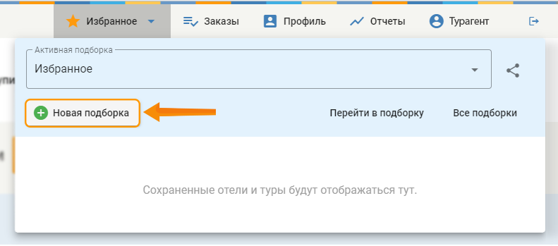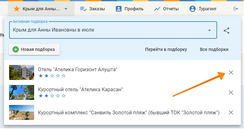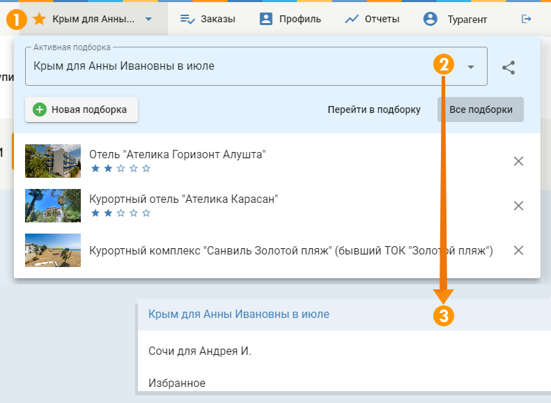 Важно – добавление ценового предложения в подборку автоматически помещает отель, тур в подборку.