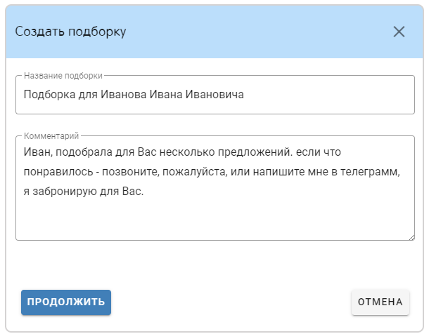2. Укажите название подборки и напишите комментарий для кого или для каких целей она создана, нажмите «Продолжить».