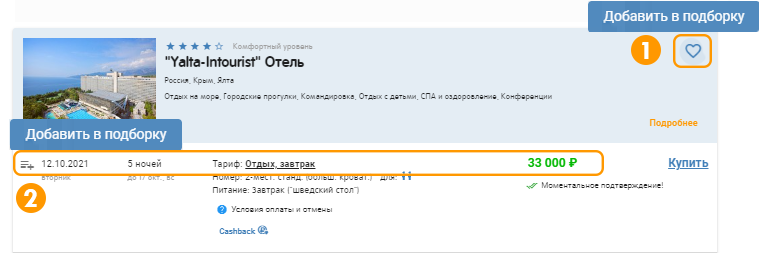 - по клику на иконку «добавить» рядом с датой заезда. Если это предложение уже есть в этой подборке иконка оранжевого цвета.