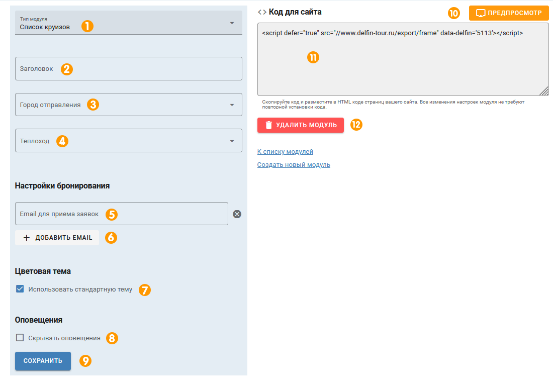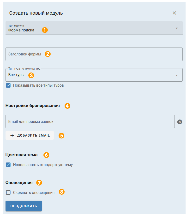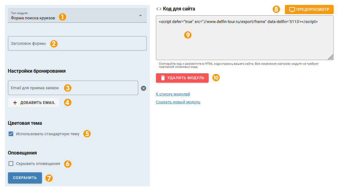 1. В типе модуля выберите «Форма поиска круизов».