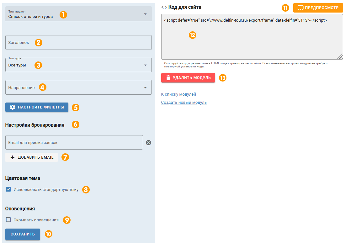 1. В типе модуля выберете «СПИСОК ОТЕЛЕЙ И ТУРОВ».