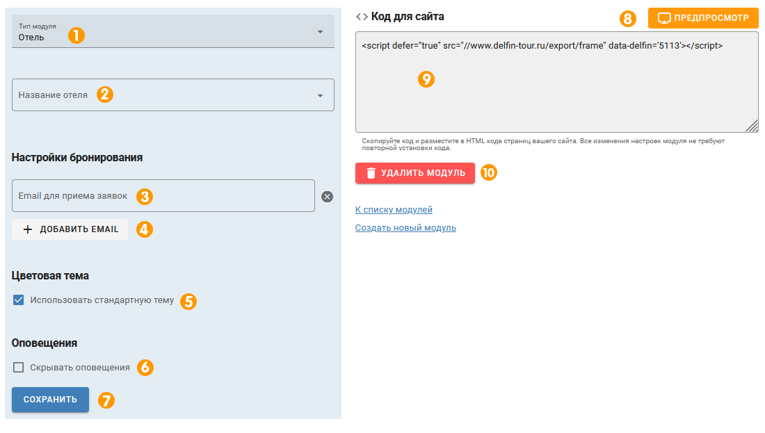 1. В типе модуля выберите «ОТЕЛЬ».