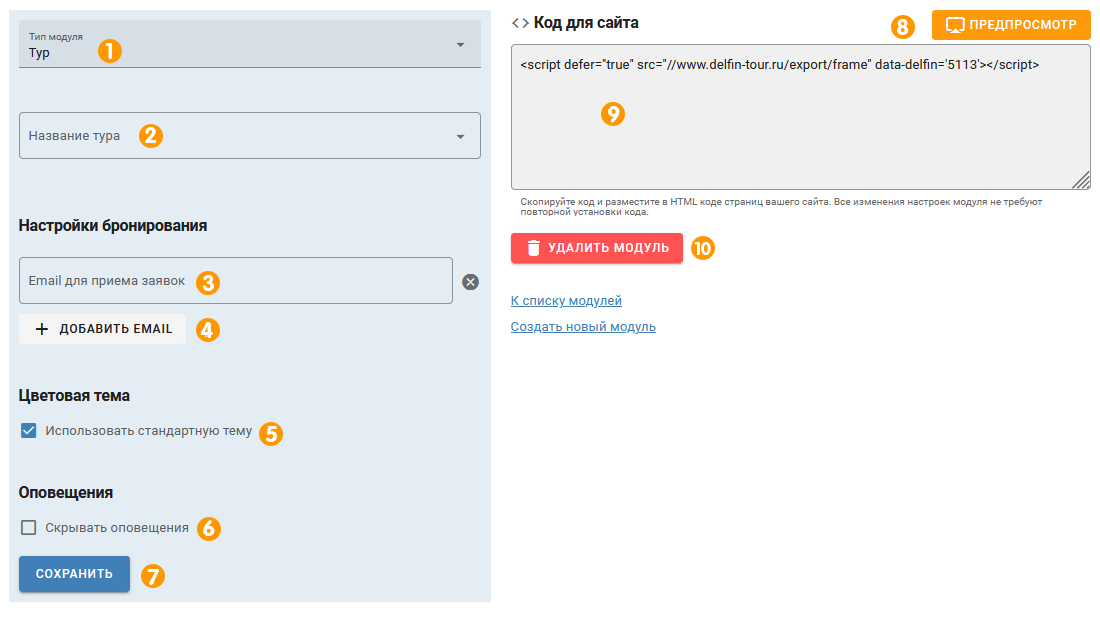 5 — ДОБАВИТЬ E-MAIL. Вы можете добавить любое количество e-mail для вашего модуля поиска, на который будут приходить заявки от туристов;